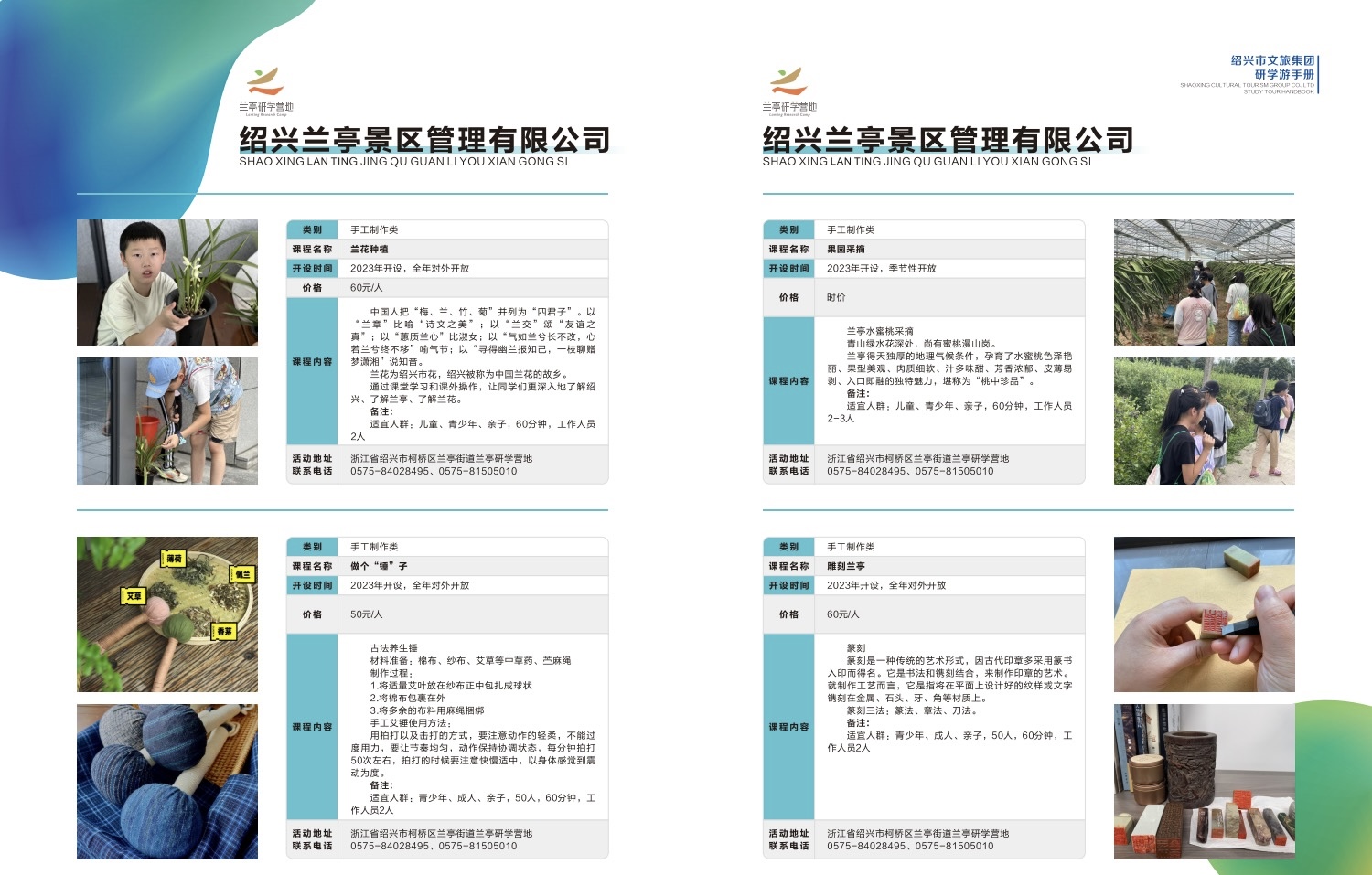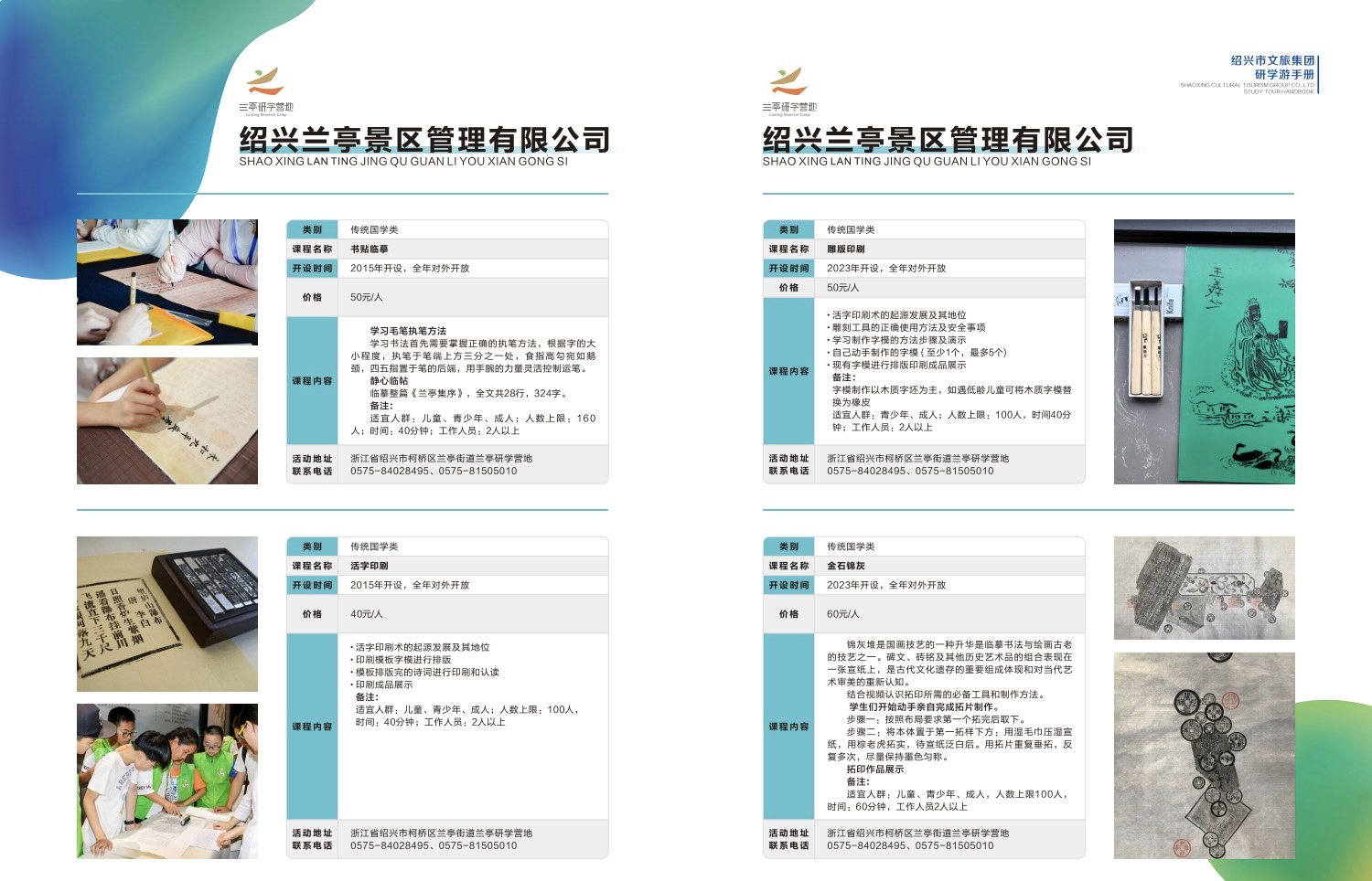 ì1+X模式,1為參觀景區(qū),X為自選課程,其中扇面描紅、石刻拓碑、曲水流觴、活字印刷、木刻版畫、臨摹蘭亭序、手工課堂成為最受學(xué)生歡迎的主題課程。