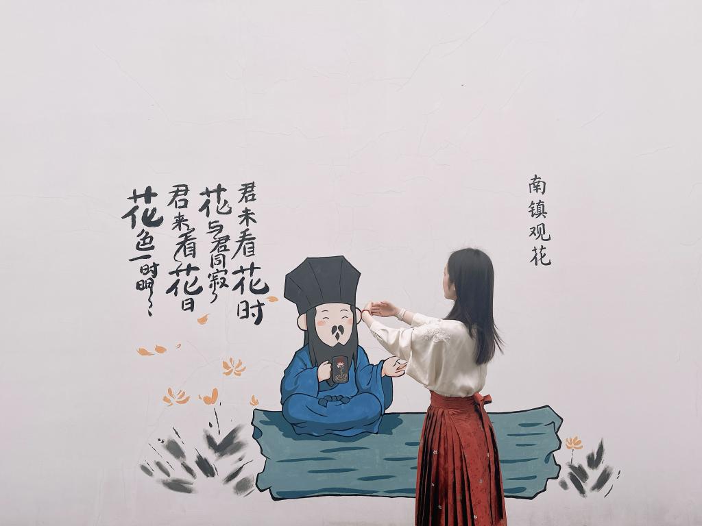 在紀(jì)念館一樓繪制了一幅南鎮(zhèn)觀花打卡墻,讓游客能夠與陽明先生進(jìn)行合影。