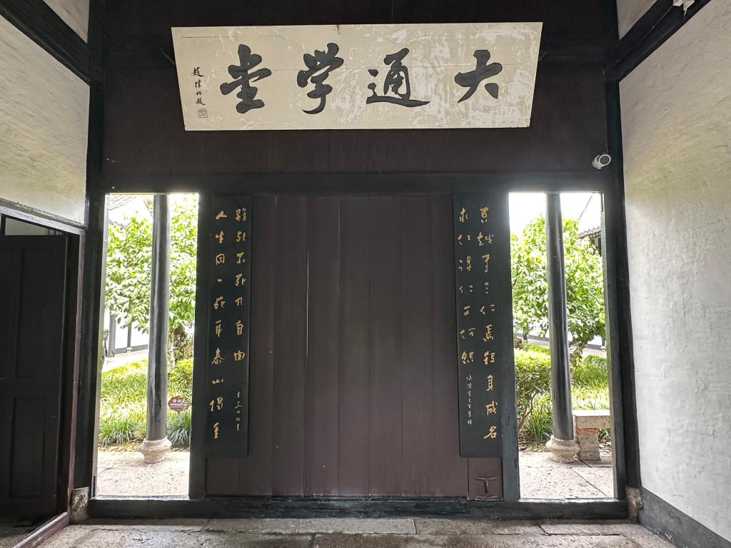 臺門斗位于大通學堂中軸線第一進,正上方懸掛的這塊“大通學堂”匾額是由前佛教協會會長趙樸初先生所題,兩側的楹聯分別是:吾越有三仁焉,殺身成名,求仁得仁又何怨;人生同一死耳,泰山獨重,雖死不死乃自由。這是由陶成章族叔陶浚宣所寫,體現出當時光復會三位紹興籍領袖徐錫麟、秋瑾、陶成章對革命抱著視死如歸的精神。