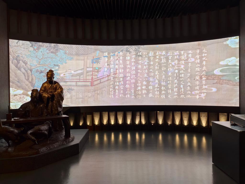 王羲之是東晉時期著名書法家。永和九年三月初三,王羲之與謝安、孫綽等41位名士在蘭亭修禊,曲水流觴,飲酒賦詩,乘興寫就了被譽為天下第一行書的《蘭亭集序》,他因此被后世尊為“書圣”,紹興也有了“書法之鄉(xiāng)”的美譽。以雕塑情景再現(xiàn)、電子屏滾動播放、觸屏?xí)鴮懟拥刃问剑佻F(xiàn)蘭亭雅集盛況