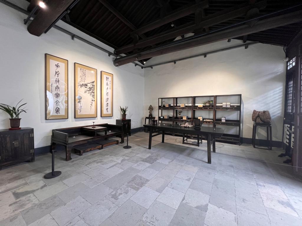 前門上方的匾額“灑翰齋”為徐渭手跡,他青少年在此習書作畫。墻面掛著《墨葡萄圖》,水墨淋漓,使中國畫的特征得到了充分的表現,同時圖上所題詩句“筆底明珠無處賣,閑拋閑擲野藤中”,更使人強烈地感受到他縱情但又不愿馴服的內心世界。兩側有吳昌碩篆書七言聯“樹角夕陽歸邋馬,花陰微雨寫來禽。仲清仁兄正譌,安吉吳俊卿”。室內陳列了畫案,文房四寶,明式書柜兼博古架,架上有仿古線裝書及仿明代瓷雜若干。北墻懸掛了蒙...