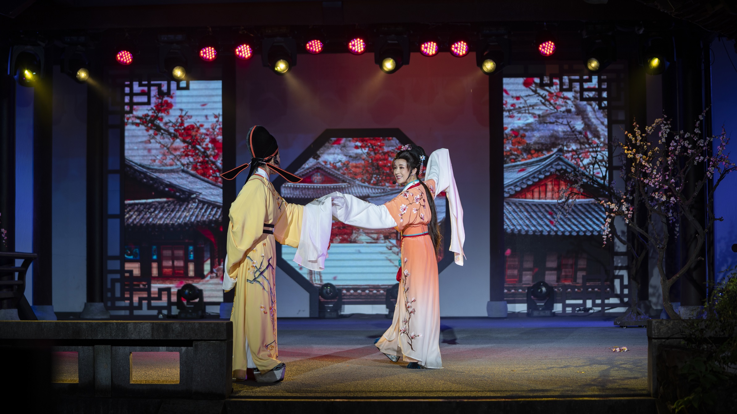 50 分鐘演出時間,讓人看得明白,也讓人理解更深刻,升華了愛情主題。新版《沈園之夜》還提升整體的表演品質,增加了燈光、舞美、視頻,內涵豐富,觀賞的層次提升。在音樂上,新版《沈園之夜》有了全新面貌,紹興戲曲元素豐富,吸收了紹興曲藝,也吸收了現代音樂手段,如合唱、交響樂等,氣勢雄偉,給人全新感覺。 新版《沈園之夜》是一臺園林實景演出,越劇、蓮花落、紹劇、鸚哥調等多種音樂元素,使優美的愛情故事更加動人,整臺演出婉約而又磅礴大氣,纏綿而不喪氣、低沉。現場表演在沈園橋間廊邊進行,加上水鄉風景的配置和屏上互動,引導觀眾走入一闋優美的《釵頭鳳》中,讓人感到整臺戲曲子美、意境美。<